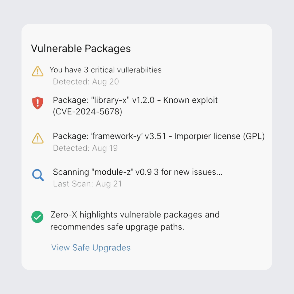 Gain deep visibility into open-source risks with SBOM generation, license guardrails, and dependency intelligence. Zero-X highlights vulnerable packages and recommends safe upgrade paths.