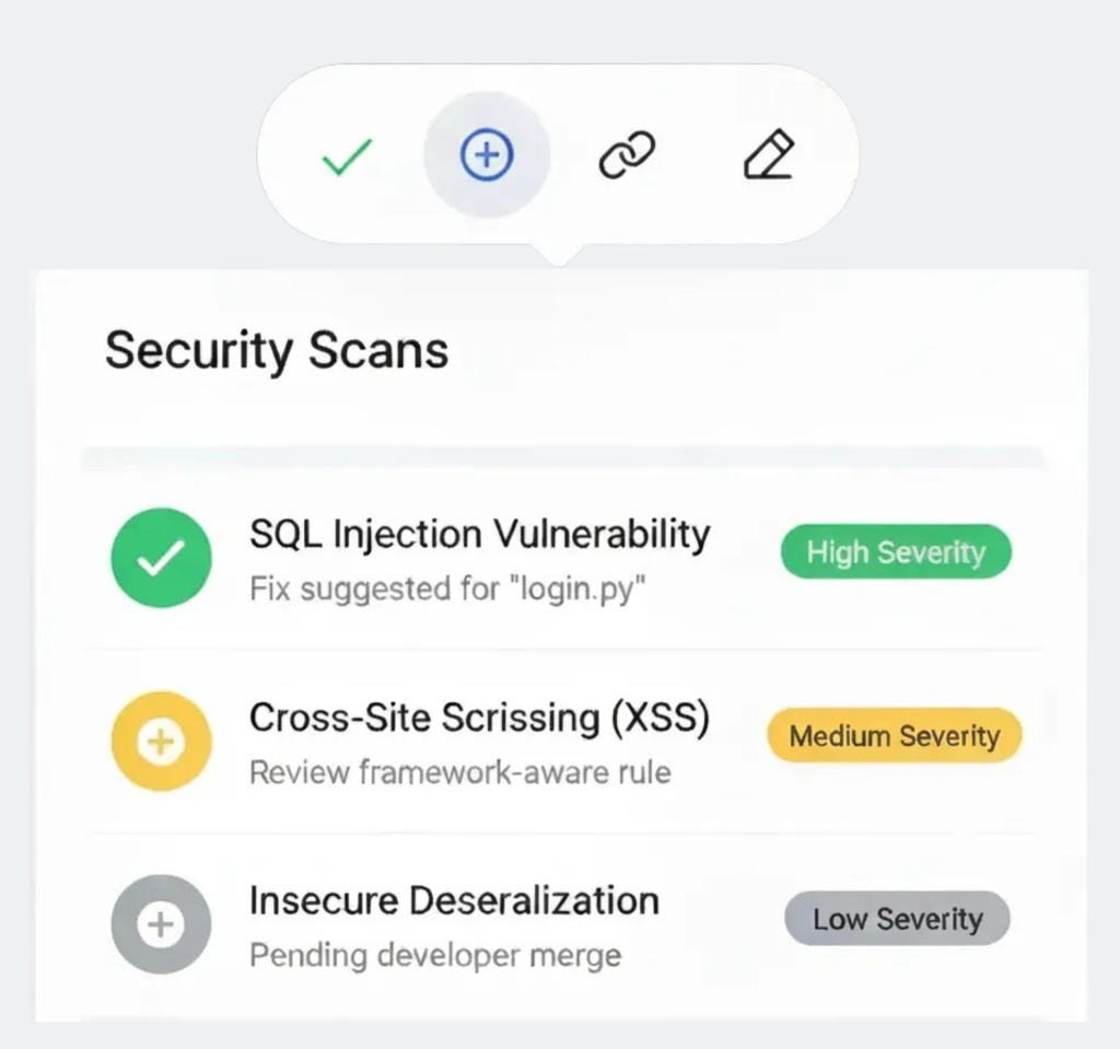 Scan code early to catch OWASP Top-10 flaws. Enforce secure merges with framework-aware policies.