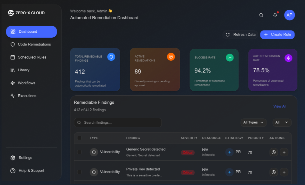 Zero-X is a unified security platform that protects your applications, code, and cloud environments with continuous monitoring, vulnerability detection, compliance checks, and automated remediation.